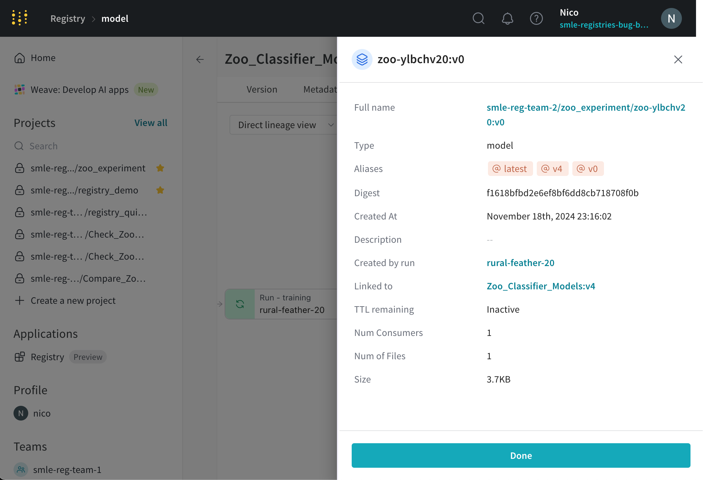 アーティファクトノードを選択して、そのアーティファクトの詳細(完全な名前、タイプ、作成時間、関連するエイリアスなど)を表示します。