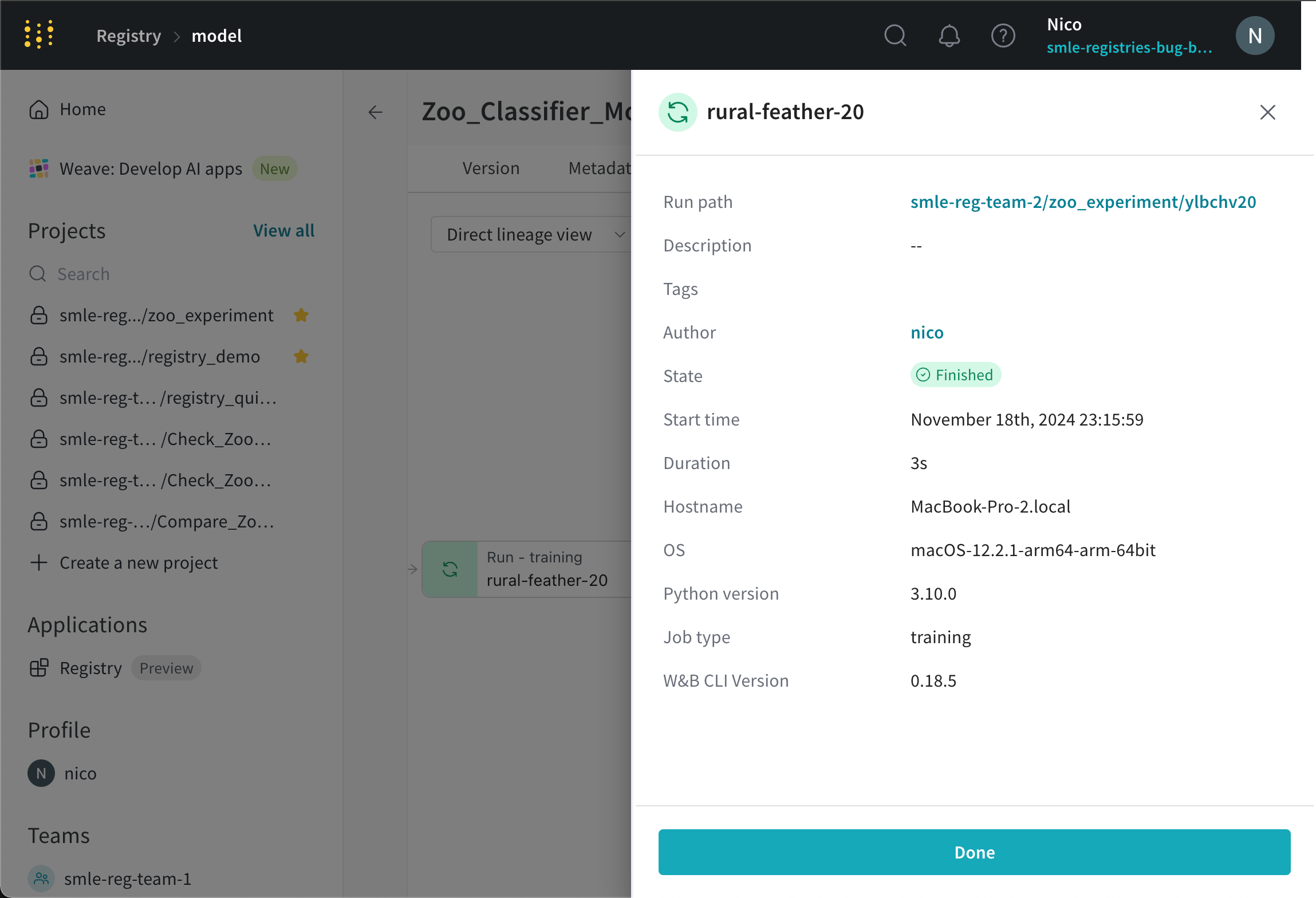 run ノードを選択して、その run の詳細(run の ID、run の名前、run の状態など)を表示します。例として、次の画像は rural-feather-20
