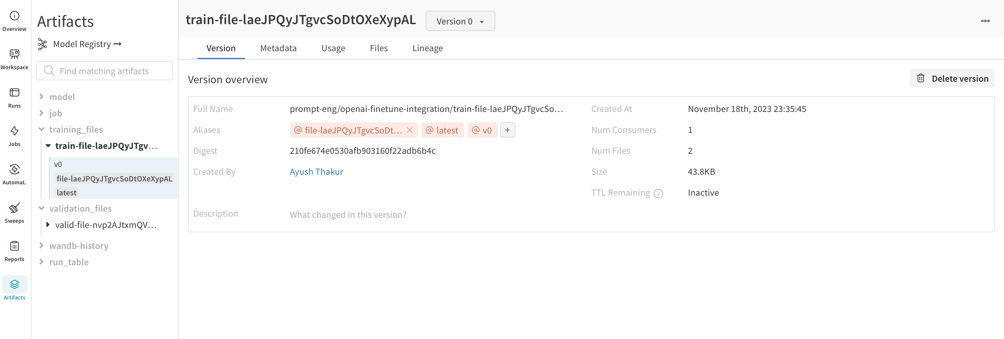 トレーニングと検証データは自動的に アーティファクト として W&B にログされます。ファインチューンされたモデルの ID を含むメタデータも アーティファクト としてログされます。